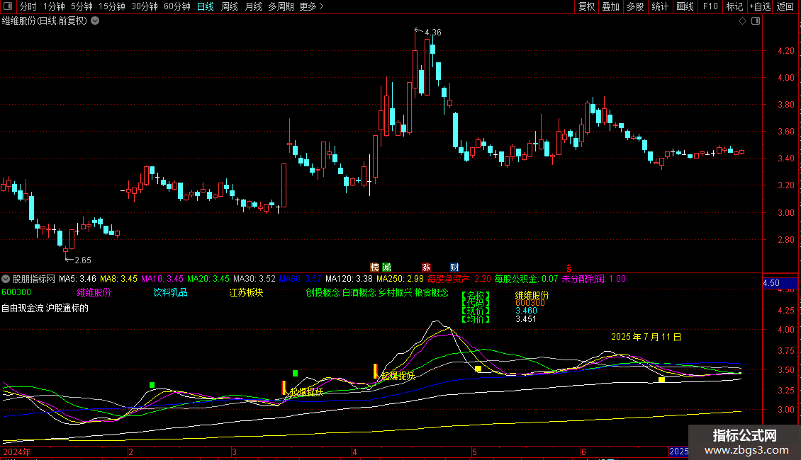 1. 信息显示:在K线图固定位置显示当前日期、股票代码、名称、所属行业/地域/概念板块、现价及均价。
