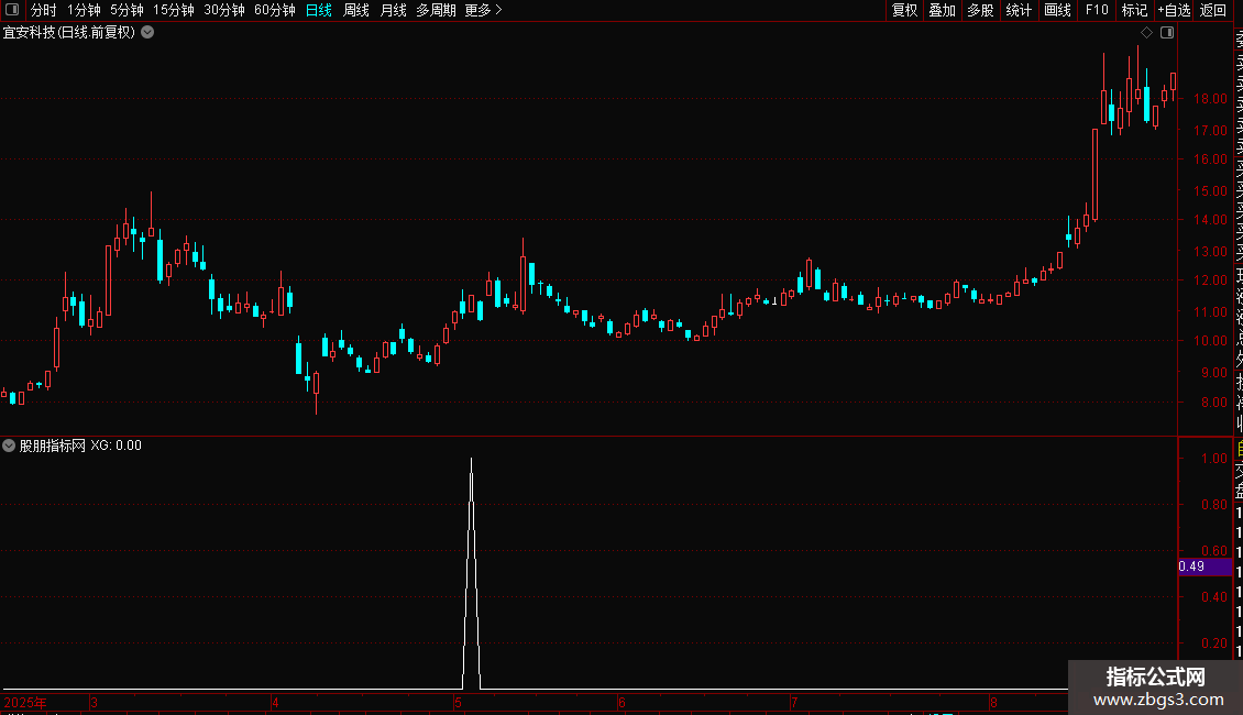 XG: A1>A2 AND A2>A3 AND A1>REF(A1,1) AND A2>REF(A2,1) AND A3>REF(A3,1) AND crOSS(MA(C,5),MA(C,60)) AND C>MA(C,60) AND 角05>70 AND 角10>60 AND 角20>45 AND COUNT(MA(C,60)>REF(MA(C,60),1),5)>3 AND O>REF(C,1);