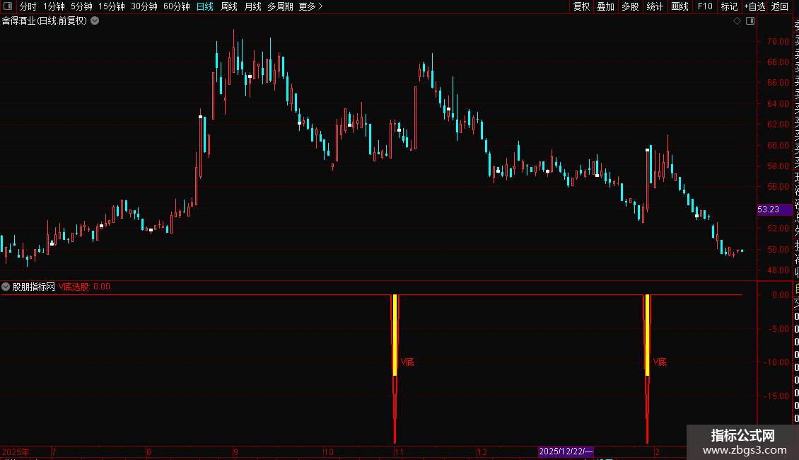 当指标在图表上出现“V底”文字及黄色柱状提示时,意味着可能的V型底部已经形成。这通常预示着下跌趋势结束,新的上涨趋势即将开始。投资者可将其作为中短线的买入参考信号,结合成交量等其他因素综合判断,以把握潜在的反弹或反转行情。