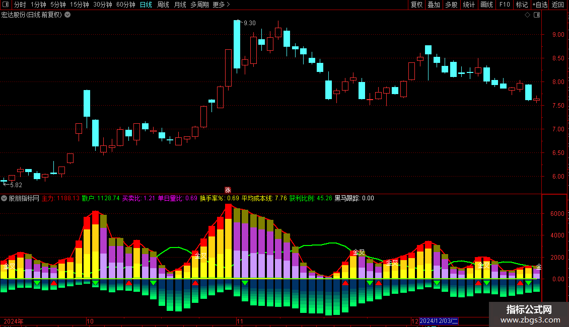 4. DDE主力绝杀:通过特定算法识别主力进场信号,以洋红色柱状图标记。