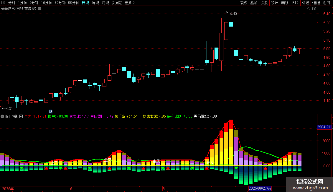 1. 主力与散户资金流向:通过计算上涨和下跌时的成交量,并分别进行平滑处理,形成“主力”(红色)和“散户”(绿色)两条能量线。用柱状图直观显示主力资金的流入强度(红色/蓝色系)和散户资金的流出强度(绿色系)。两线“金叉”时进行文字提示。
