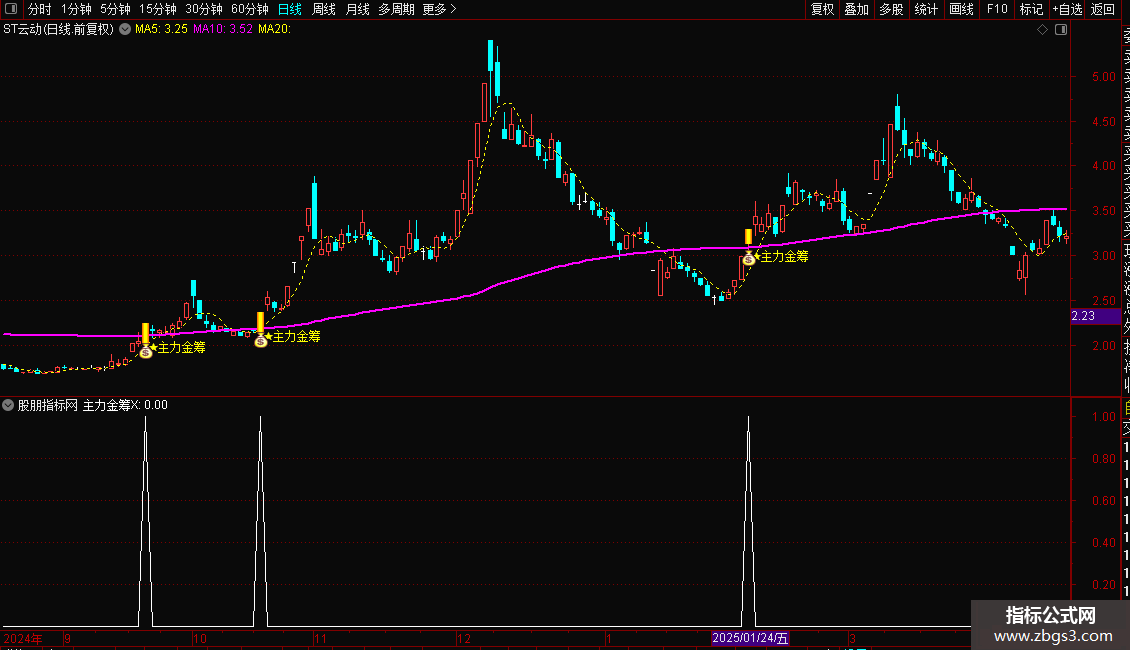 1. 主图公式:导入通达信主图指标后,金筹线(COLORFF00FF)为核心参考位,当个股均线呈多头排列(MA10>MA20>MA60),且股价涨停突破金筹线时,出现的彩色涨停柱和星星提示为买入信号;