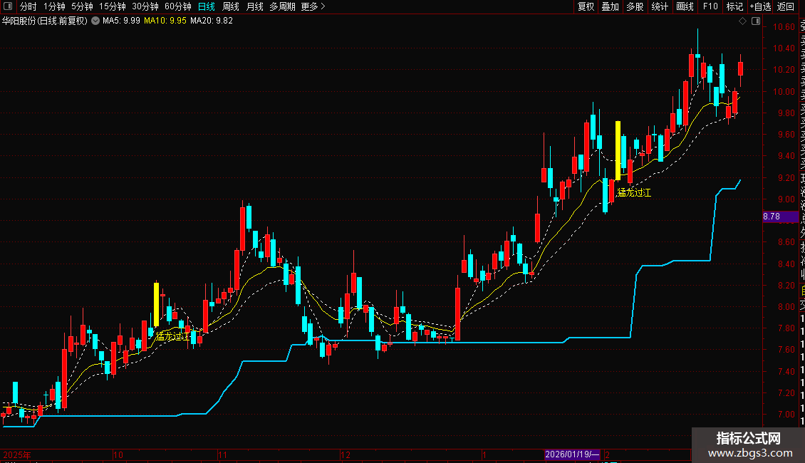 1. 主图公式:导入后在K线图显示关键均线与主力成本,当出现黄色“猛龙过江”文字时,代表个股当日拉升力度强、收盘价逼近最高价,是短期强势信号;