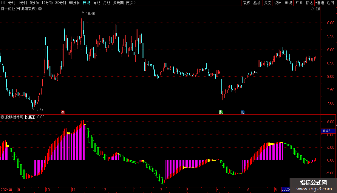 指标通过多组均线、价格偏离度及成交量分析,识别趋势状态与底部信号。主图以柱状线区分“持股”、“持币”、“反转”、“洗盘”四种状态,并设有“抄底王”文字标记,提示潜在底部反弹机会。适用于中短线趋势跟踪与超跌反弹捕捉。