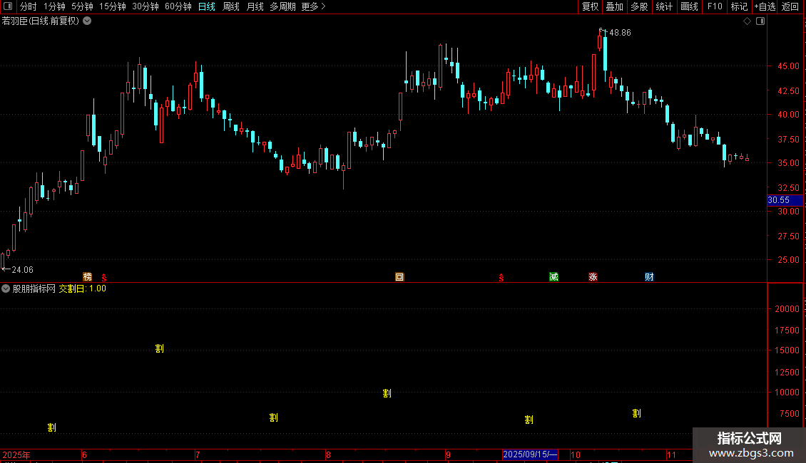 3. 在K线对应位置显示黄色“割”字。