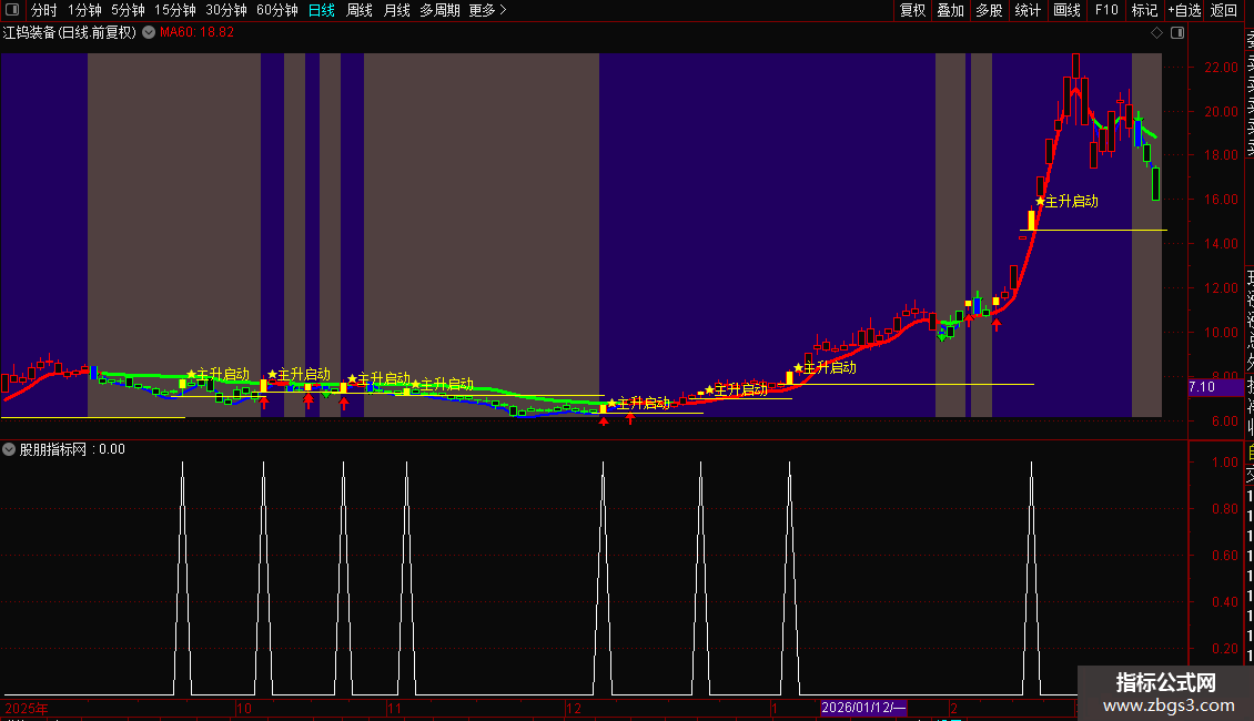 1. 主图核心:通过色彩、图标、文字标注直观区分主升/弱势区间,量能异动星标锁定启动点;
