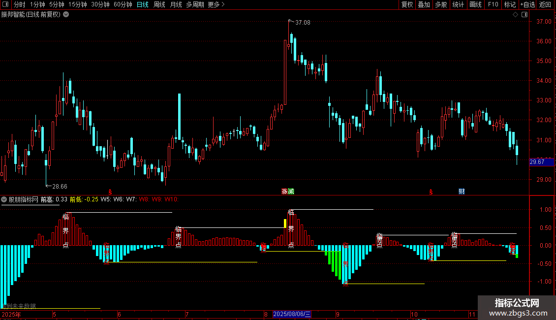 观察MACD柱状线与“前高”、“前低”趋势线的相对位置。当红色柱体突破白色“前高”线时,可能预示上涨动能增强;当青色柱体跌破黄色“前低”线时,可能预示下跌动能加强。同时关注“临”、“界”、“点”的文字提示位置,它们标识了潜在的阻力或支撑临界区域。
