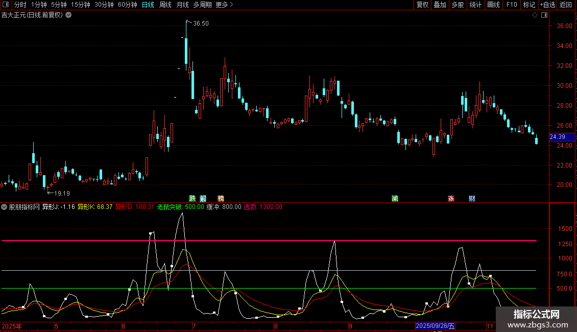 指标结合了筹码分布、KDJ及价格区间,通过异形J、K、D三条线进行动态分析。异形J线为核心波动线,异形K线为短期趋势线,异形D线为长期趋势线。老鼠突破、缓冲、逃顶为三条水平参考线,用于识别关键突破位与风险区域。指标旨在捕捉价格在筹码与动能共同作用下的趋势转折点。