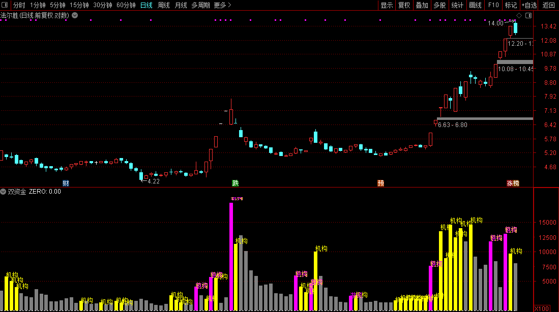 1. 机构强度(黄柱) :当出现黄色柱体并标注“机构”时,代表趋势型资金进场。