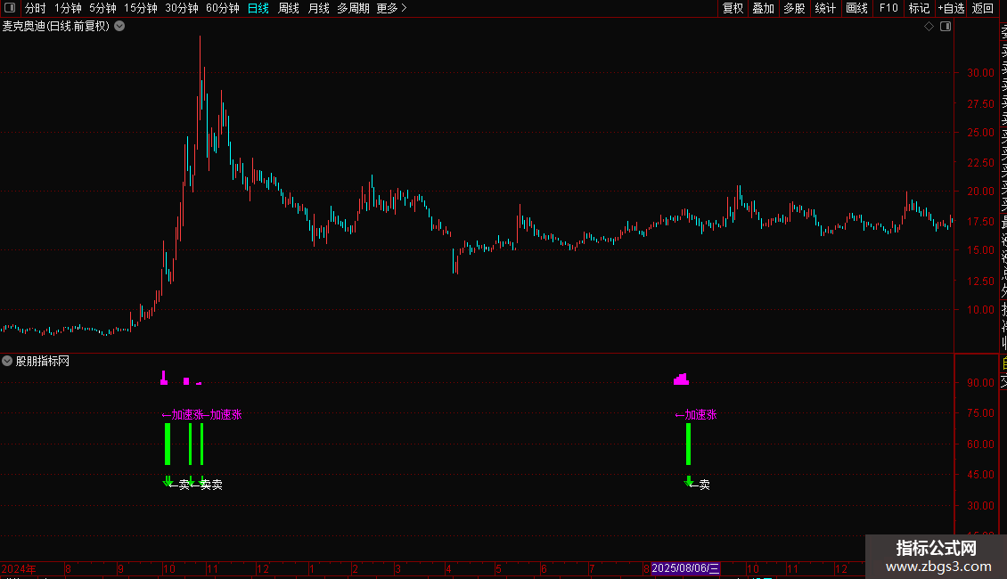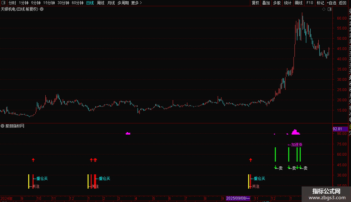 指标主要功能是结合日内动态高低点计算支撑阻力位,并利用长期随机指标判断超买超卖状态。操作策略上,当趋势线处于低位并出现拐头向上,且股价位于中线下方时,视为关注或买入信号,尤其突破关键低位时提示重仓;反之,当趋势线高位拐头向下且股价在中线上方时,提示加速上涨后的卖出机会。核心在于低买高卖,配合中线过滤虚假信号。