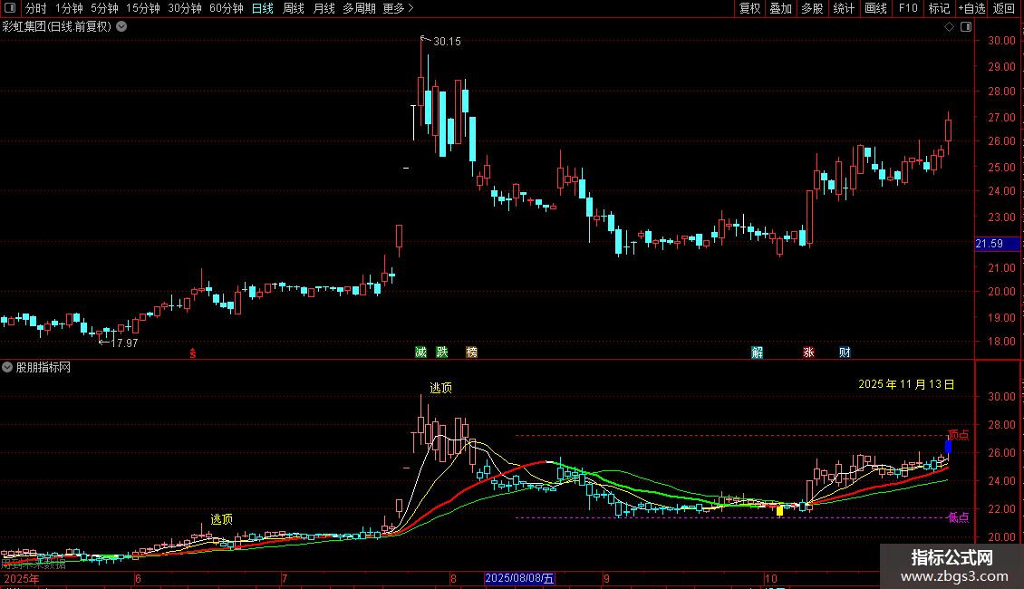 1. 趋势与均线系统:通过“买线”和“卖线”的交叉定义多空状态,并用红/青色K线直观显示。同时绘制多条均线(5、10、20、30日),其中20日均线会随涨跌变色。