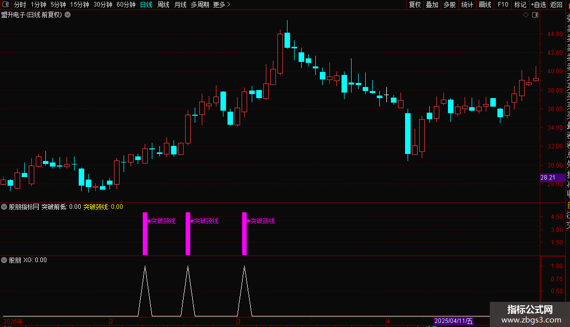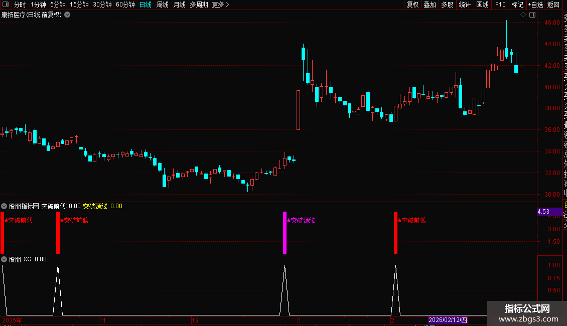 指标专门用于捕捉“黄金坑”形态后的突破买点。其核心逻辑是寻找股价在短期内急跌挖坑,随后企稳并重新站上关键压力位的走势。主要功能识别两种强势信号:一是股价放量突破前期低点形成的坑底压力,确认洗盘结束;二是股价突破颈线位,确立双底或头肩底形态完成。操作策略上,当副图出现红色柱体及“突破前低”文字时,可视为激进建仓点;出现紫色柱体及“突破颈线”文字时,为趋势确认的稳健加仓点,适合短线博弈主升浪。