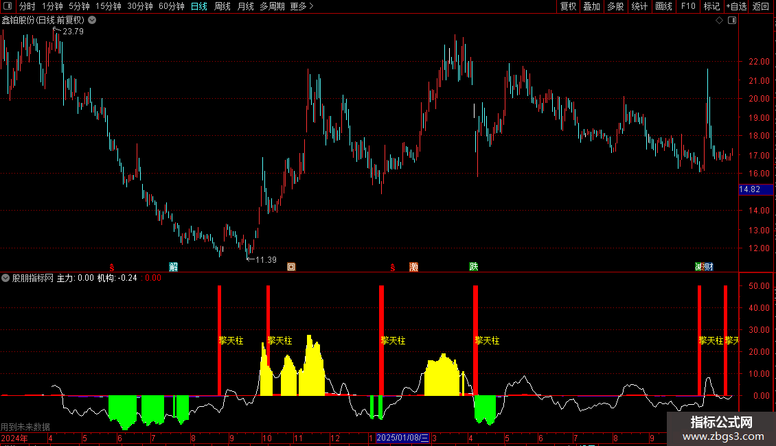 机构线:围绕零轴波动。当其为较大正值(黄色柱)时,表示股价强势,机构可能做多;当其为较大负值(绿色柱)时,表示股价弱势,机构可能做空或观望。