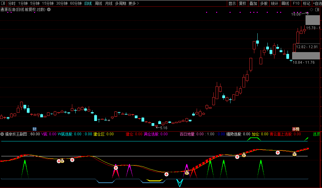 看见黄/紫色柱子开始关注,出现红色信号可以试买,出现洋红色持有或加仓,出现绿色就跑。