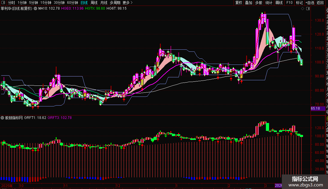 当满足条件HGGF时,在收盘价和开盘价位置之间画柱状线,宽度为1.0,0不为0则画空心柱.,COLORFF33FF