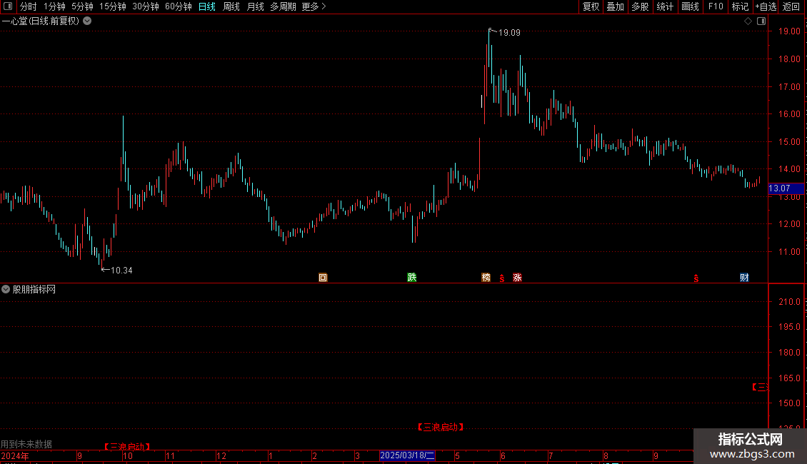 4. 当同时满足“20%周期出现底部转折”(`EN3`)和“上涨初期仅得到一次小周期确认”(`ZTJZ10=1`)时,在图表对应K线的低价位标注“【三浪启动】”文字提示。