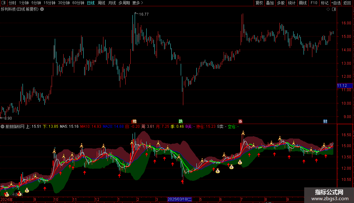 指标是一个综合性技术分析工具,融合了趋势、通道、动量与买卖信号。