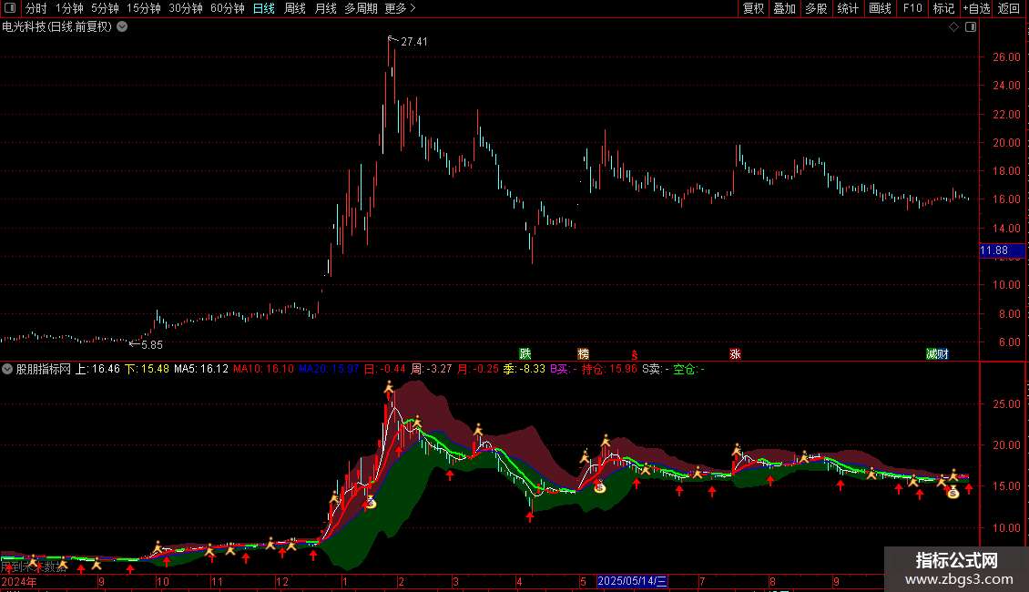 5. 买卖指导线:通过自定义的指导线与价格均线交叉,定义B买、持仓、S卖、空仓四种状态。