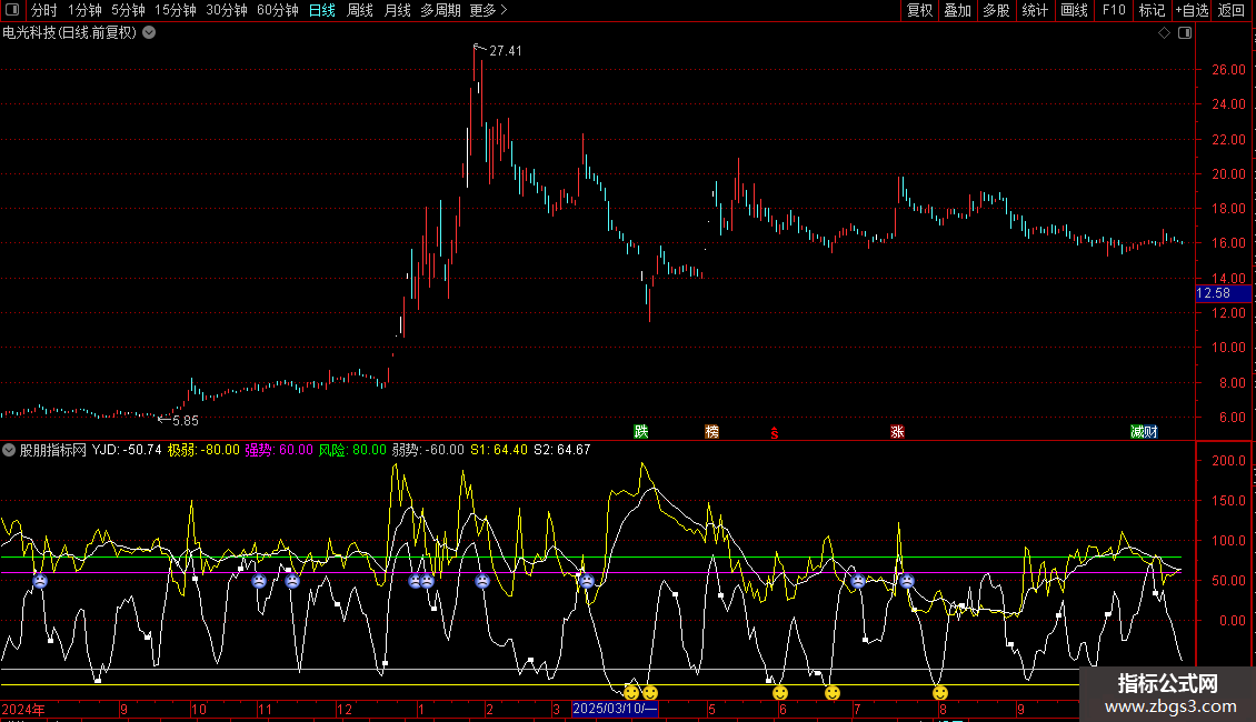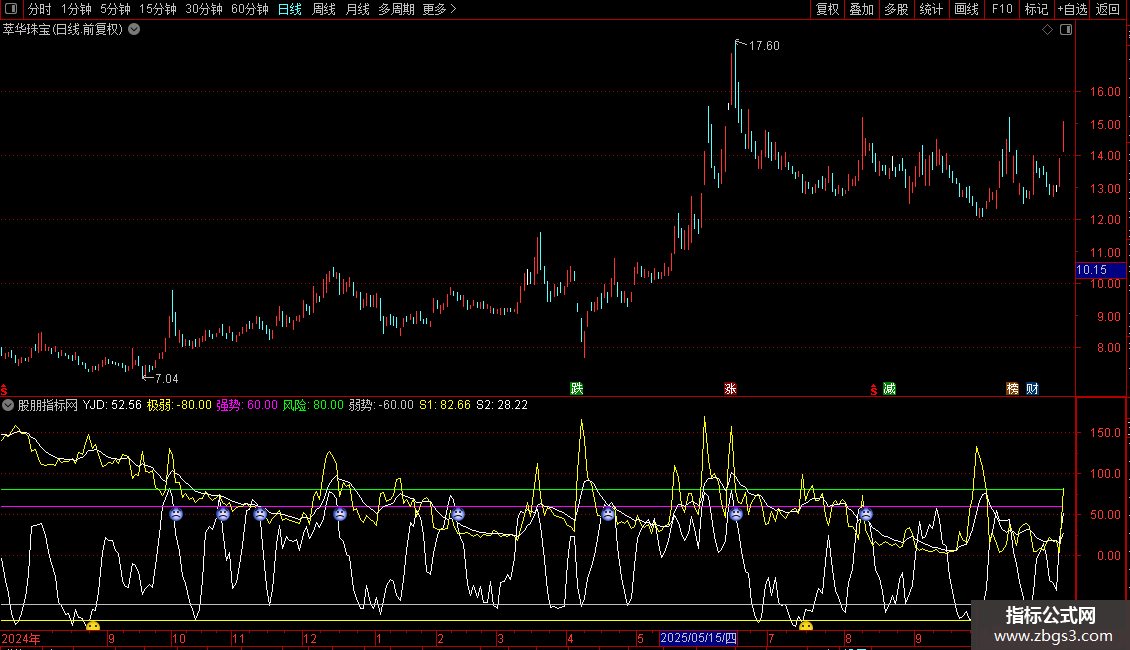 指标包含两个核心部分:YJD和S系列线,用于判断超买超卖和资金强弱。