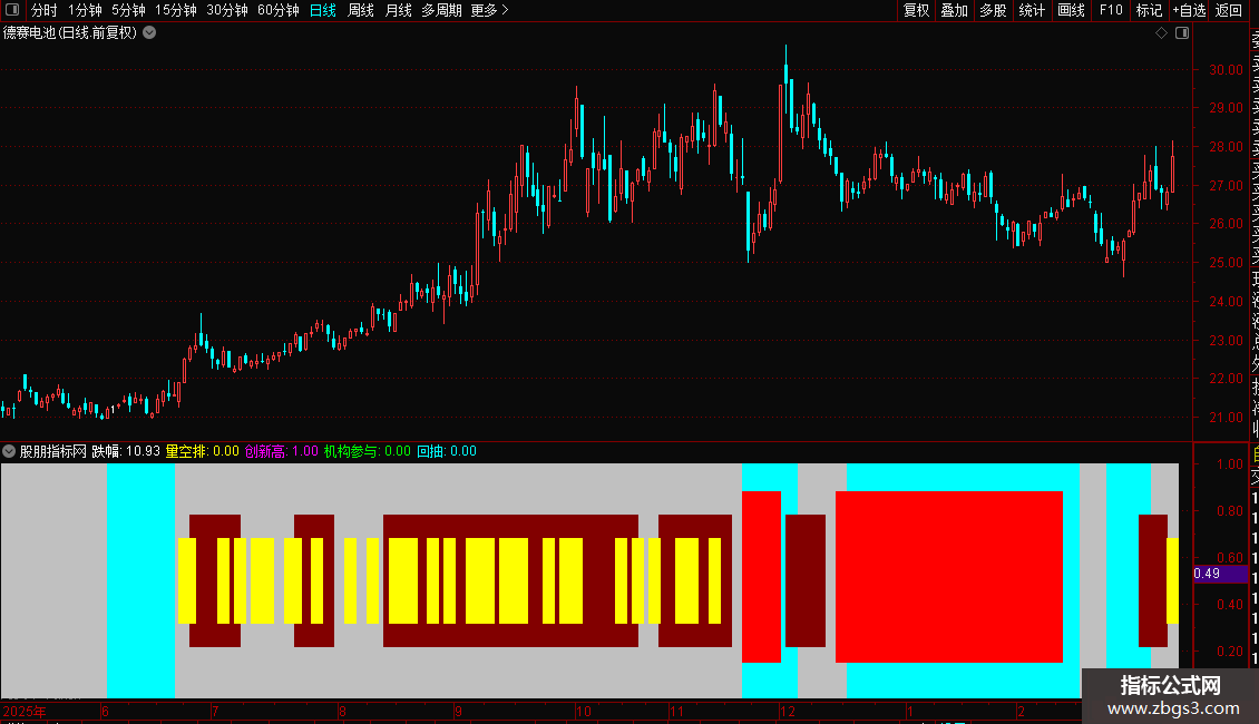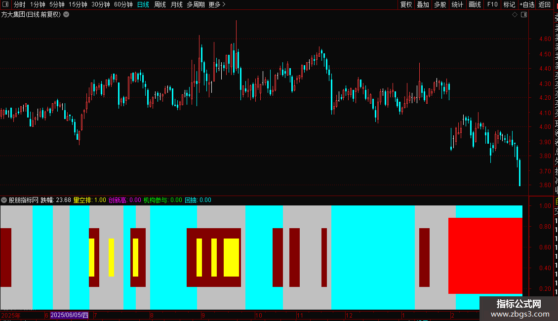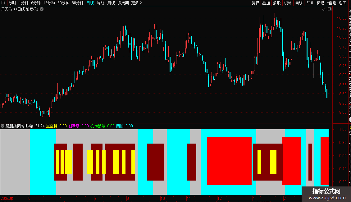 指标核心是结合 20 日均线判断股价趋势,先识别股价在均线上方 / 下方持续运行的阶段,再对比两个阶段的时间周期,结合黄金分割位、成交量和价格形态,判断股价回抽关键价位的信号。