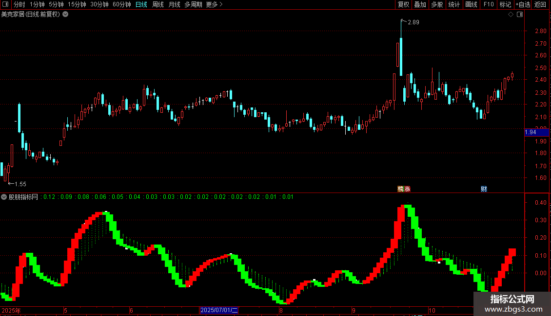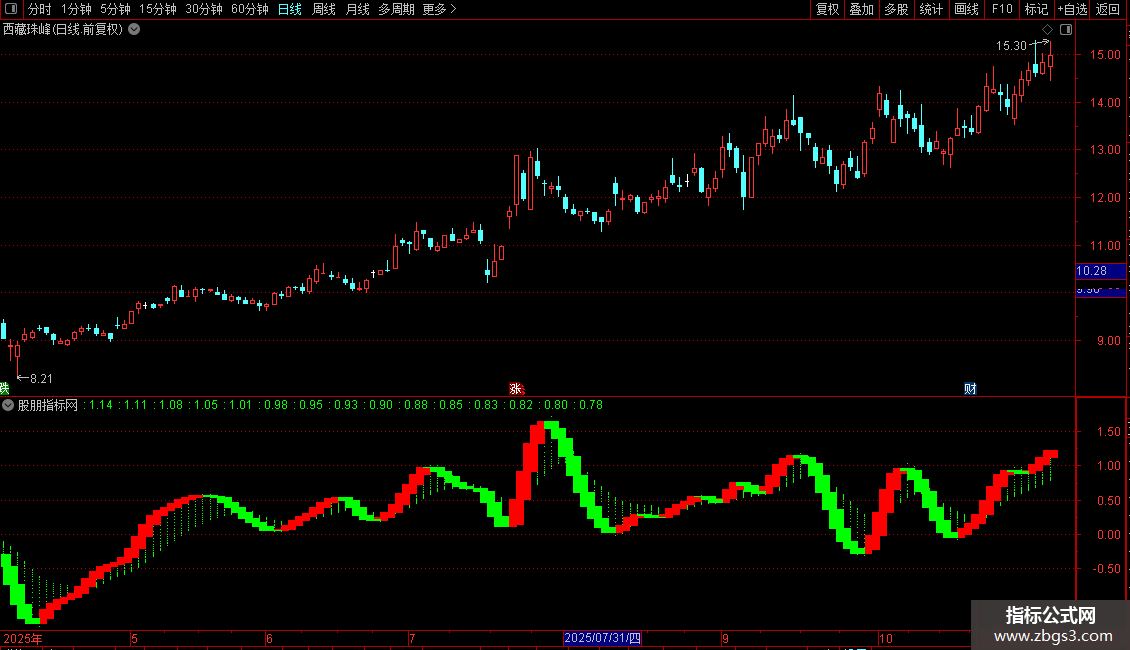主图柱线:根据 `TOWERC` 当前值是否大于前一日值,绘制红色(上涨)或绿色(下跌)的柱状图。柱体宽度不同,形成类似“宝塔”的立体视觉效果,直观显示趋势强弱。
