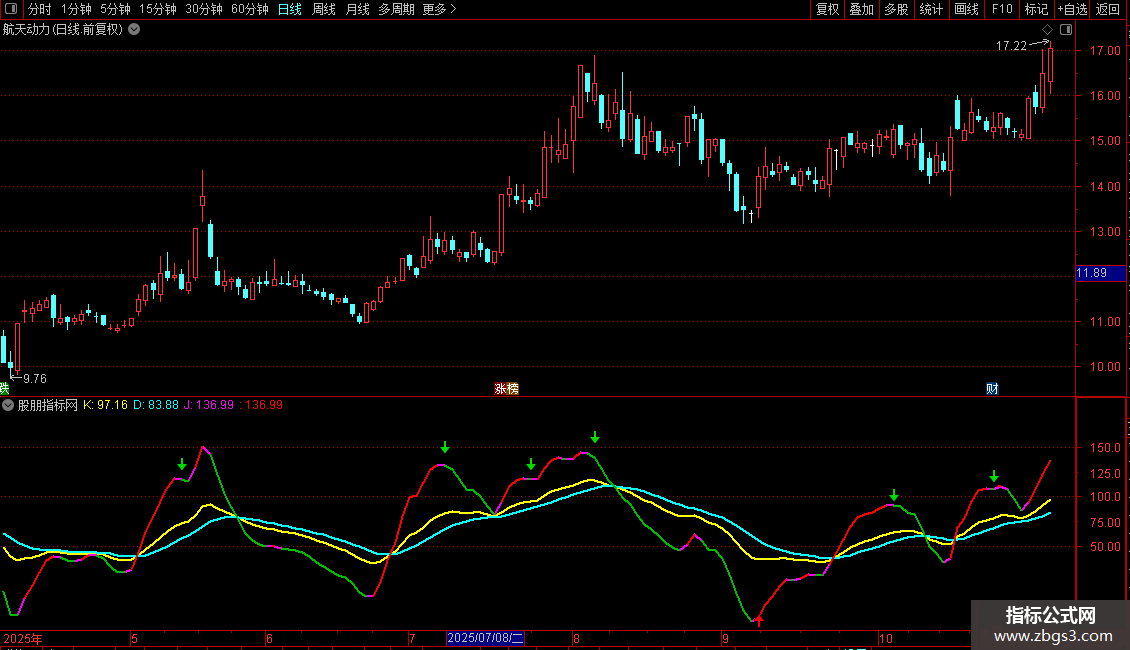 指标基于价格均值与标准差构建,通过计算K、D、J三条曲线分析价格偏离与动量变化。K线反映价格偏离均值的程度,D线为K线的平滑,J线为两者的差值。指标通过颜色区分J线涨跌,并在特定条件满足时显示买入或卖出图标。