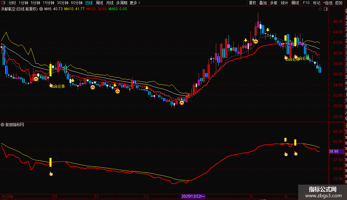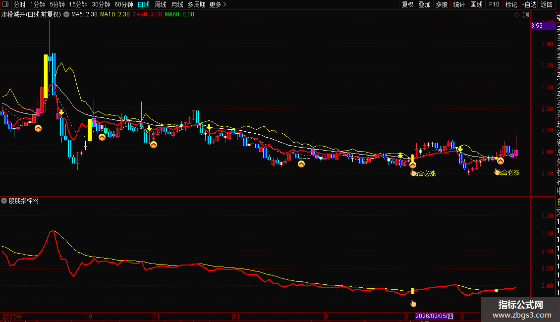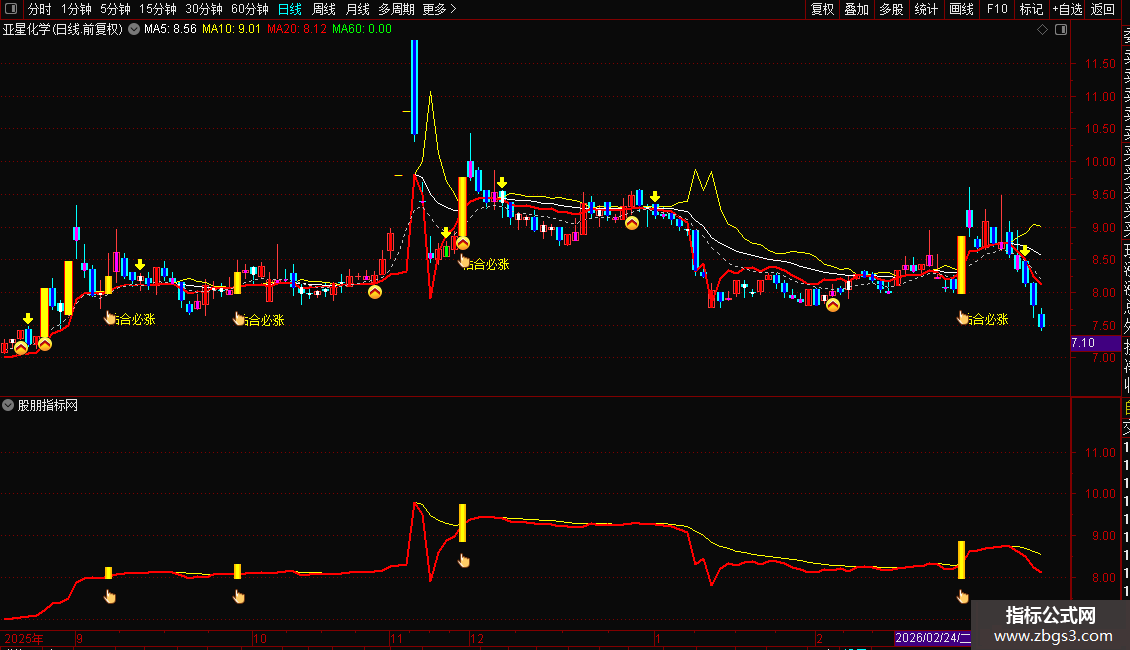 3. 打开主副图观察:若主图出现黄色“粘合必涨”文字+彩色柱体,副图同步出现黄色K线柱,且股价站稳灰色支撑线,即为共振买点。