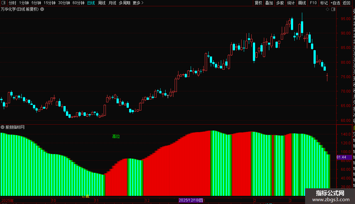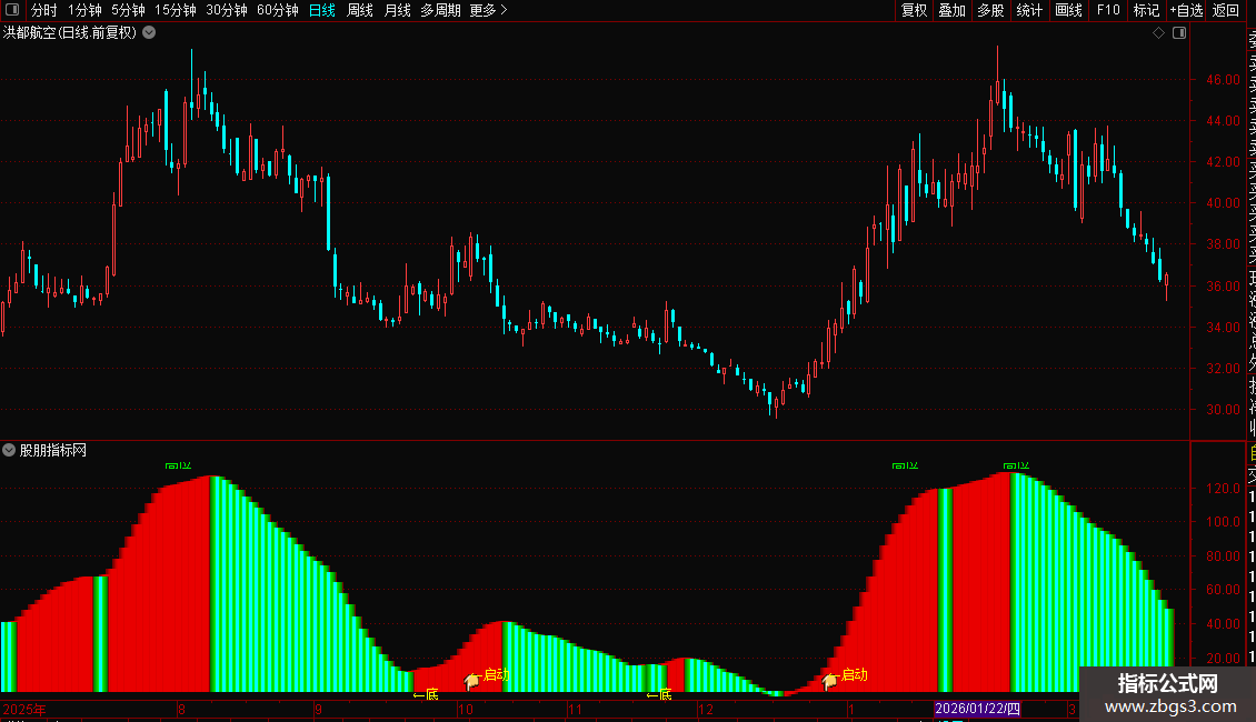 指标是一个综合性的趋势与买卖点提示系统。主要功能是通过多重均线、波动率及资金流向算法,判断股价所处的相对高低位及趋势强弱。操作策略上,当出现彩色柱状体由绿转红或数值上升时,代表多头动能增强,可视为持股或买入信号;当柱状体转绿或数值下降,提示风险增加应考虑减仓。此外,指标会在超跌区域提示“底”部机会,在均线金叉且处于低位时提示“启动”信号,辅助投资者捕捉趋势反转点。