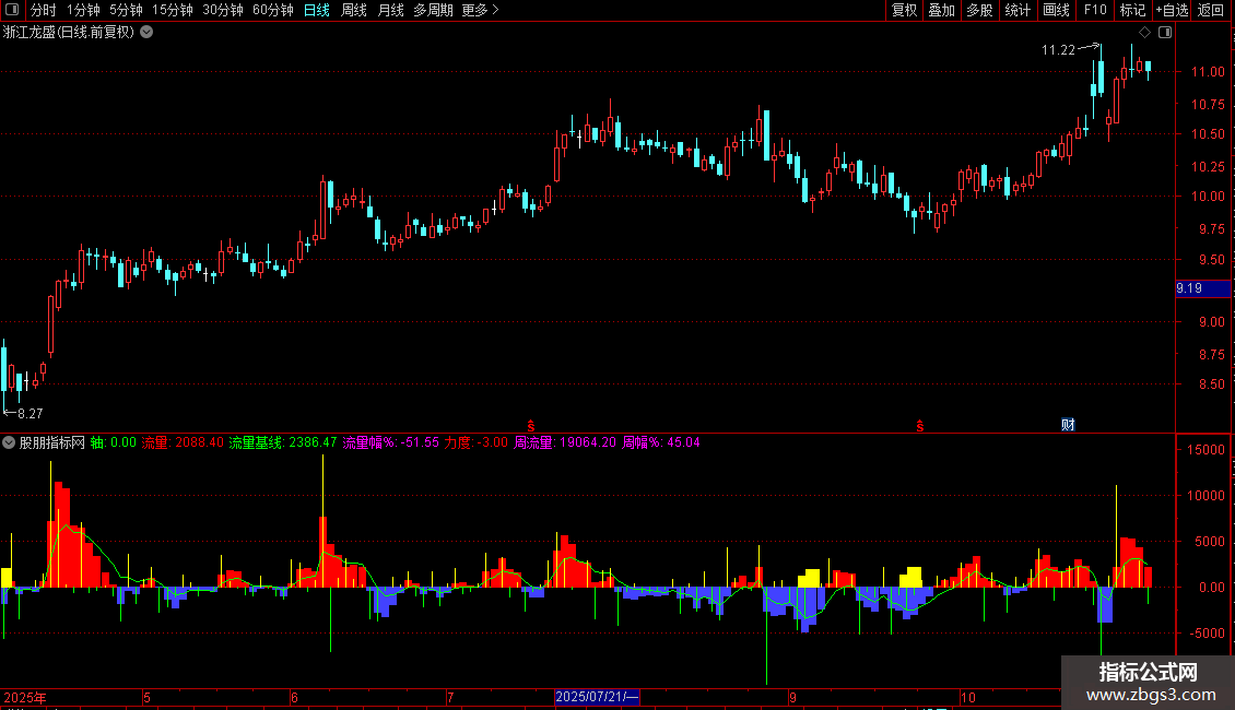 - 观察“流量”柱状图与“流量基线”的关系,判断资金趋势。