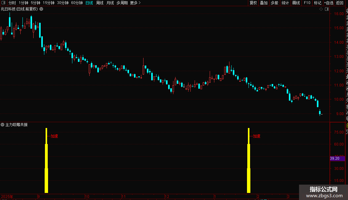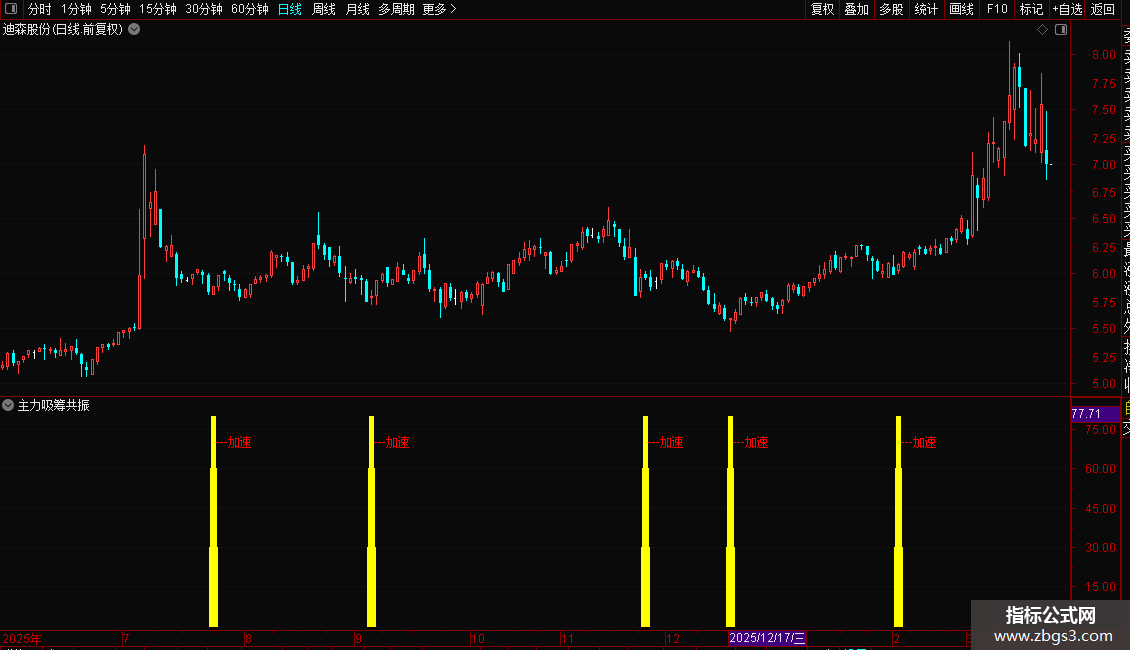 当满足所有综合条件(VARG33)时,在副图以彩色柱状线和“---加速”文字标注,直观提示趋势可能进入加速阶段。