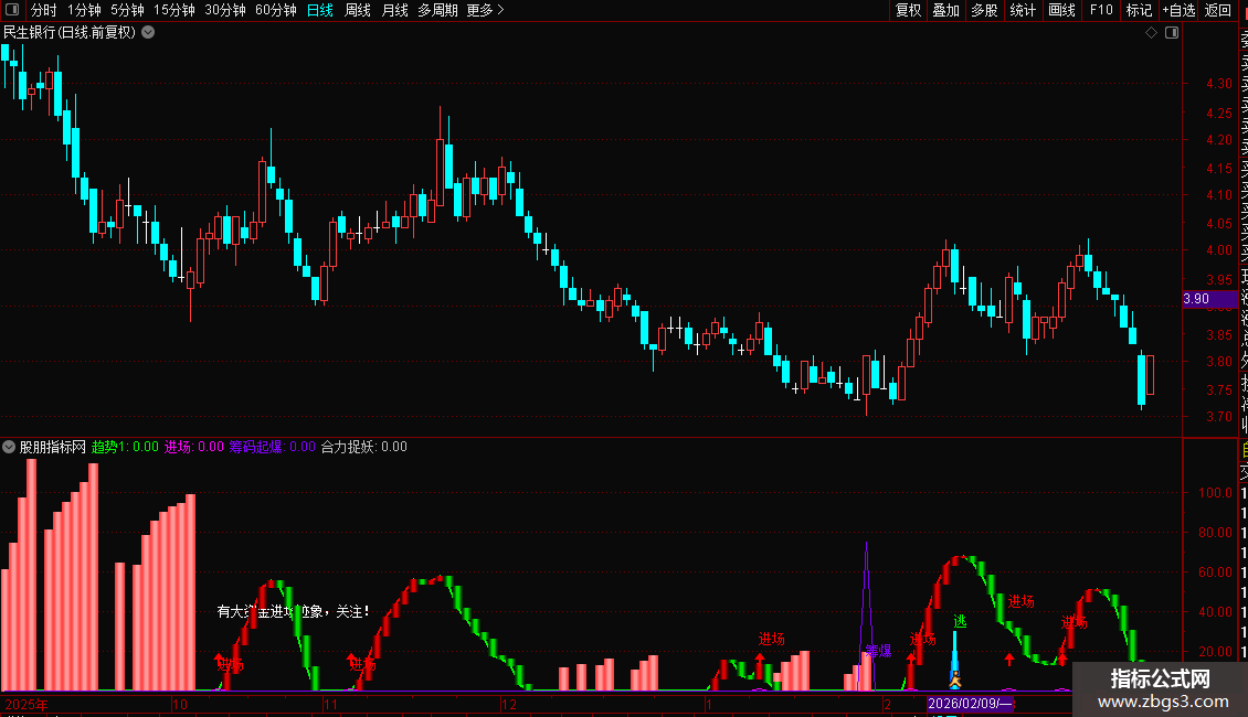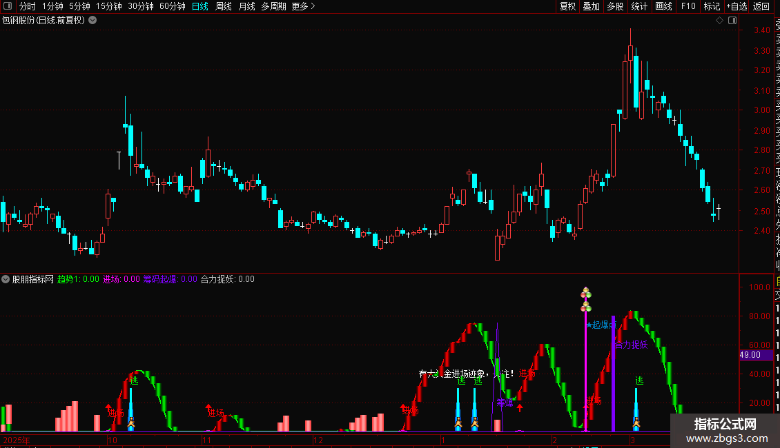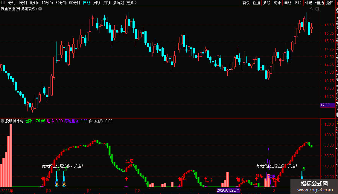 2. 进场时机:指标显示“进场”红色文字+向上箭头,且“趋势1”由绿转红时,为潜伏良机;“有大资金进场迹象”提示资金异动,需跟踪量能是否持续放大。