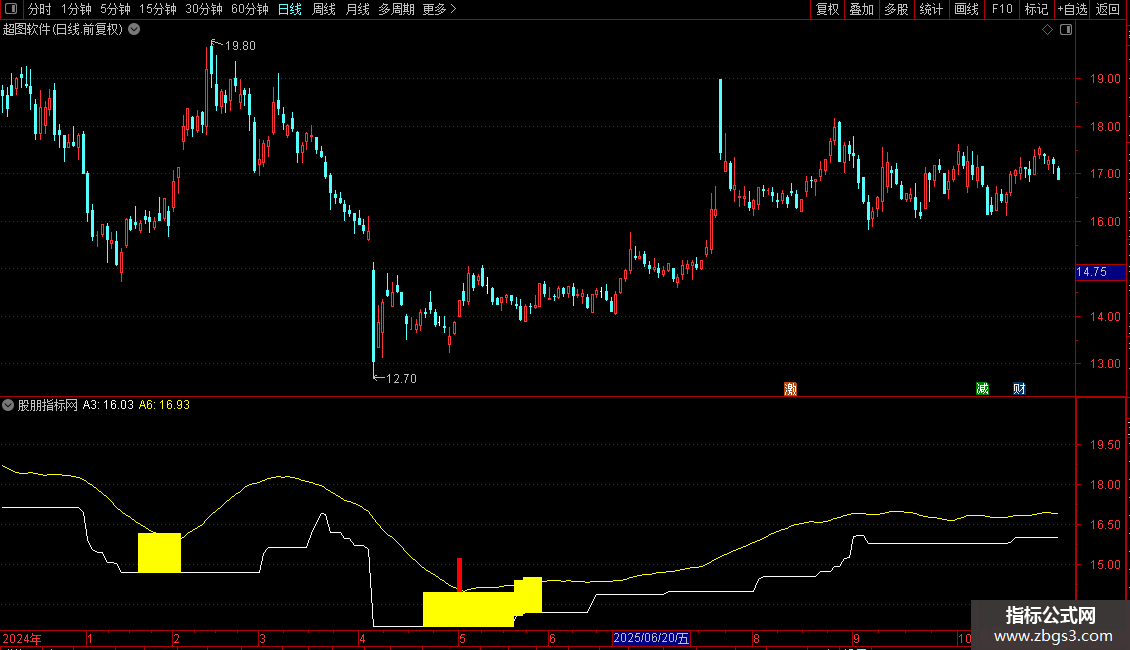 基础条件预警:当仅满足MACD“基础”条件时,用黄色柱状线进行标注,提示潜在关注位置。
