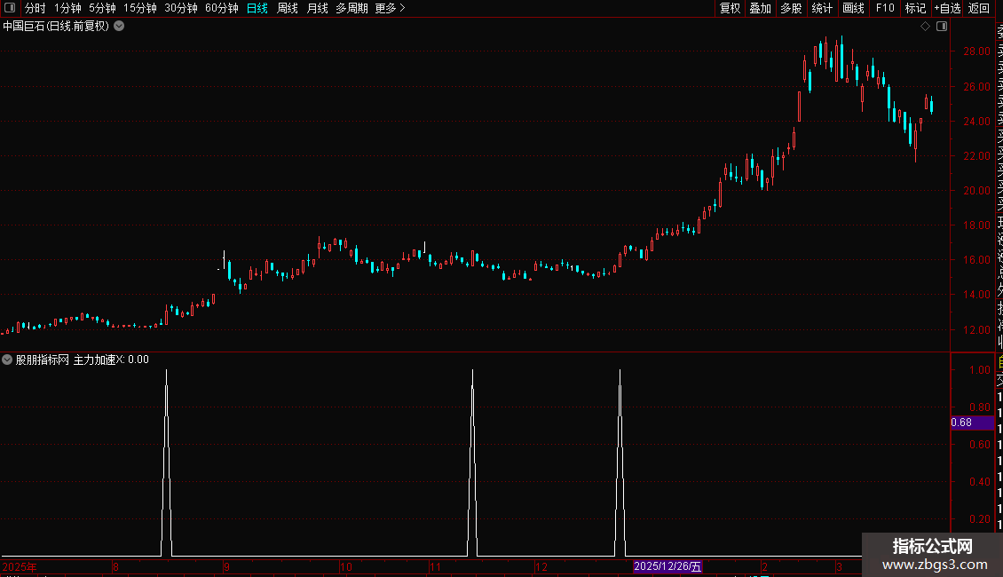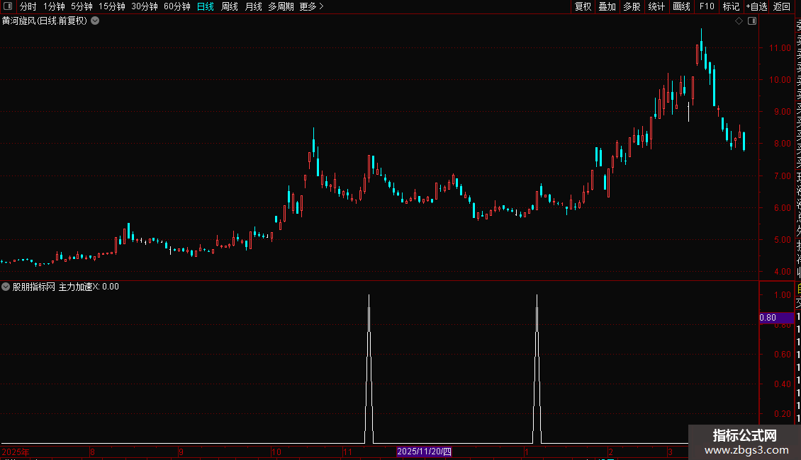 主力加速X:crOSS((XG13>XG14 AND XG9>XG11 AND XG8>REF(XG8,1)),0.5) AND XG6>XG7 AND (XG1-O)>=0.5;