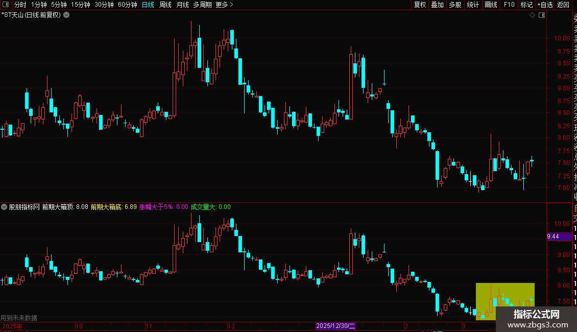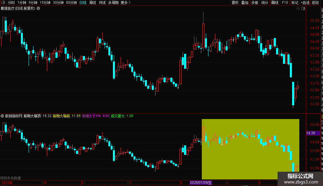 1. 绘制箱体:自动识别近期的高低点,形成一个箱体区间,并用色带标注。