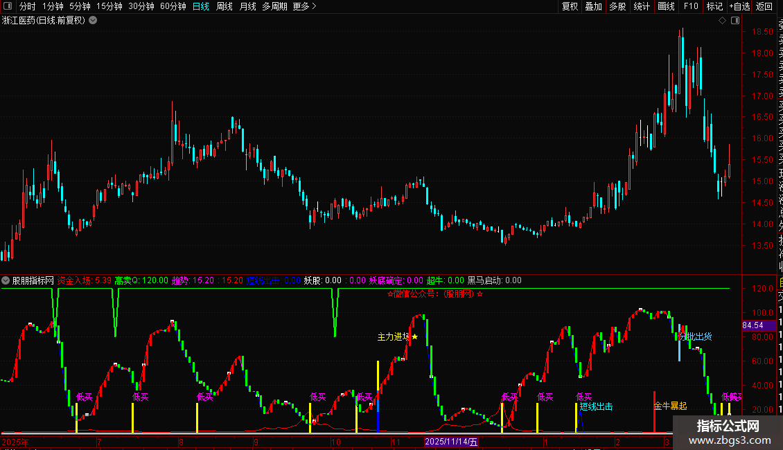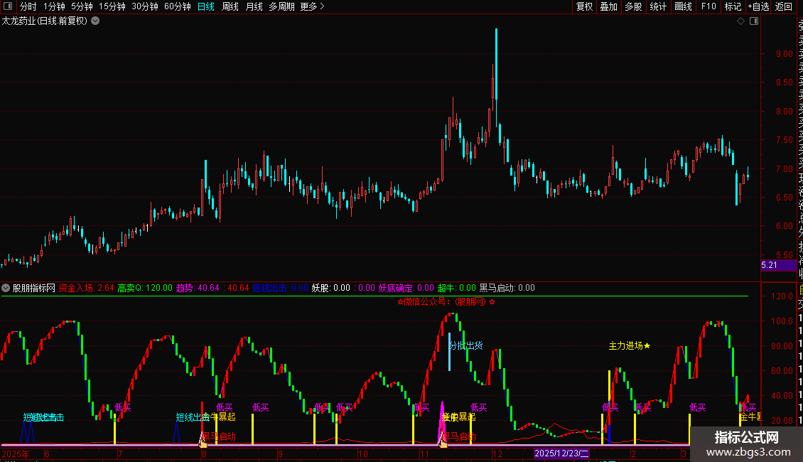 1. 副图出现“主力进场★”黄色标注,且伴随红黄蓝三色柱,代表7日内资金金叉+连续下跌后的主力进场信号,可关注低吸机会;
