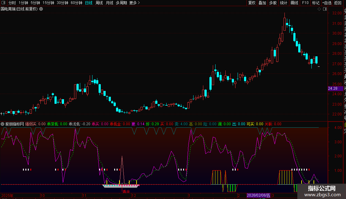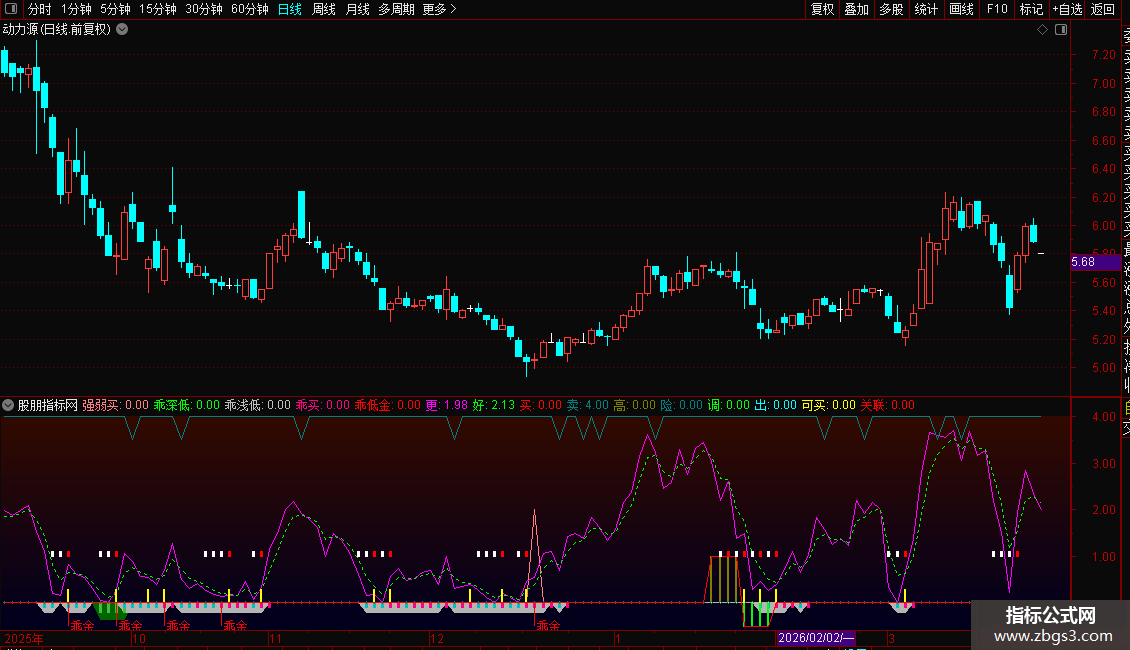 指标是一个多维度的超跌反弹与趋势共振系统。核心功能是结合乖离率、随机指标及DMI趋势强度,精准识别股价严重偏离均线后的极值低点,并确认主力进场信号。操作策略上:当出现黄色“可买”柱或红色“买”字信号时,表明股价已处低位且动能转折,是左侧抄底良机;若同时出现棕色强势柱,则意味着趋势强劲,可加大仓位持有;一旦显示青色“可卖”或“出”字信号,提示短期风险释放或趋势转弱,应果断止盈离场。