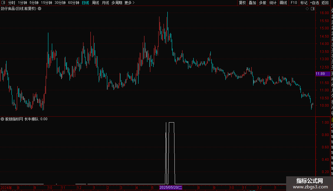 指标用于识别“长牛排队”形态,结合周线与日线MACD以及均线系统进行综合判断。