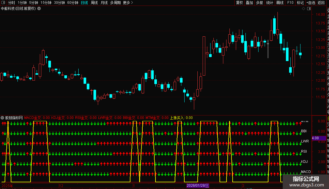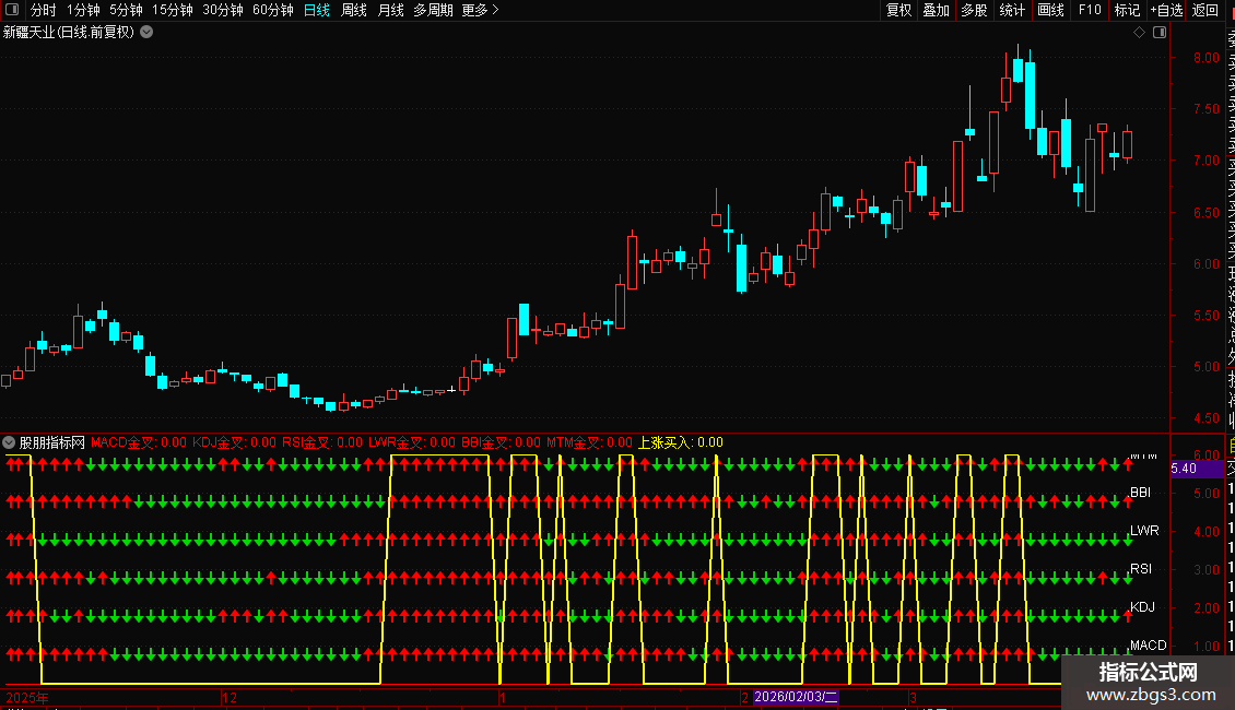 指标整合了MACD、KDJ、RSI、LWR、BBI和MTM六个常用技术指标,并对其金叉信号进行可视化。