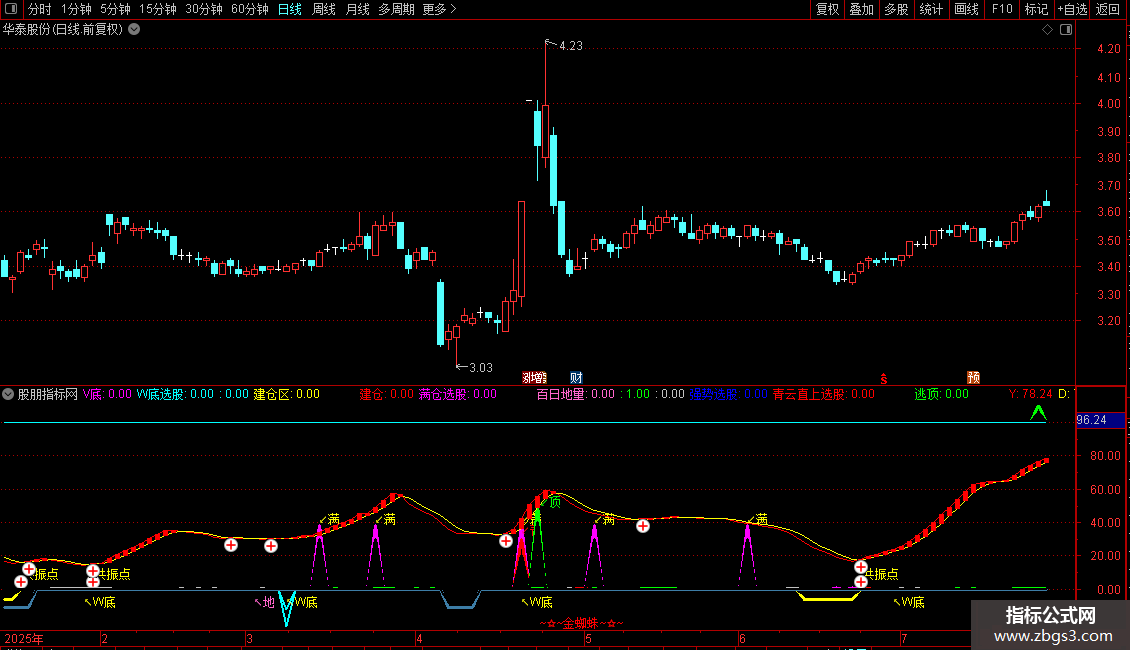 共振点、W底、金蜘蛛、满仓、青等文字标记均为潜在的买入或看涨信号。