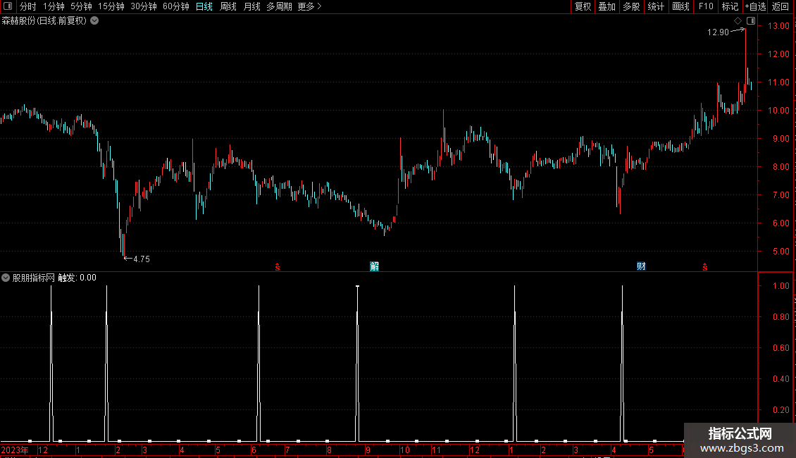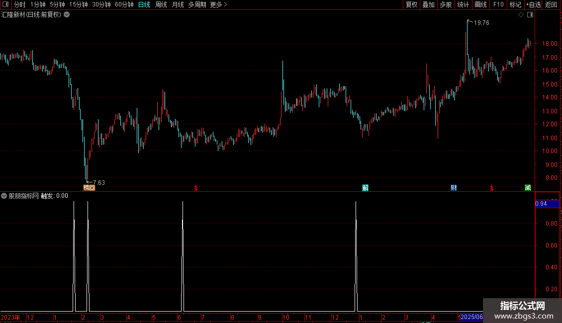 输出为“触发”信号,满足所有条件时标记为1。指标适用于趋势初期或回调后的再次启动阶段,常需结合其他分析手段综合判断。