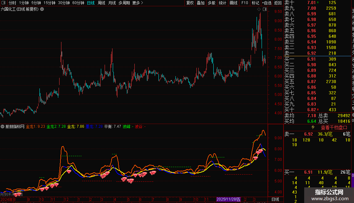 - 墨龙:收盘价的LL日指数移动平均线,其上涨部分用不同颜色突出显示。