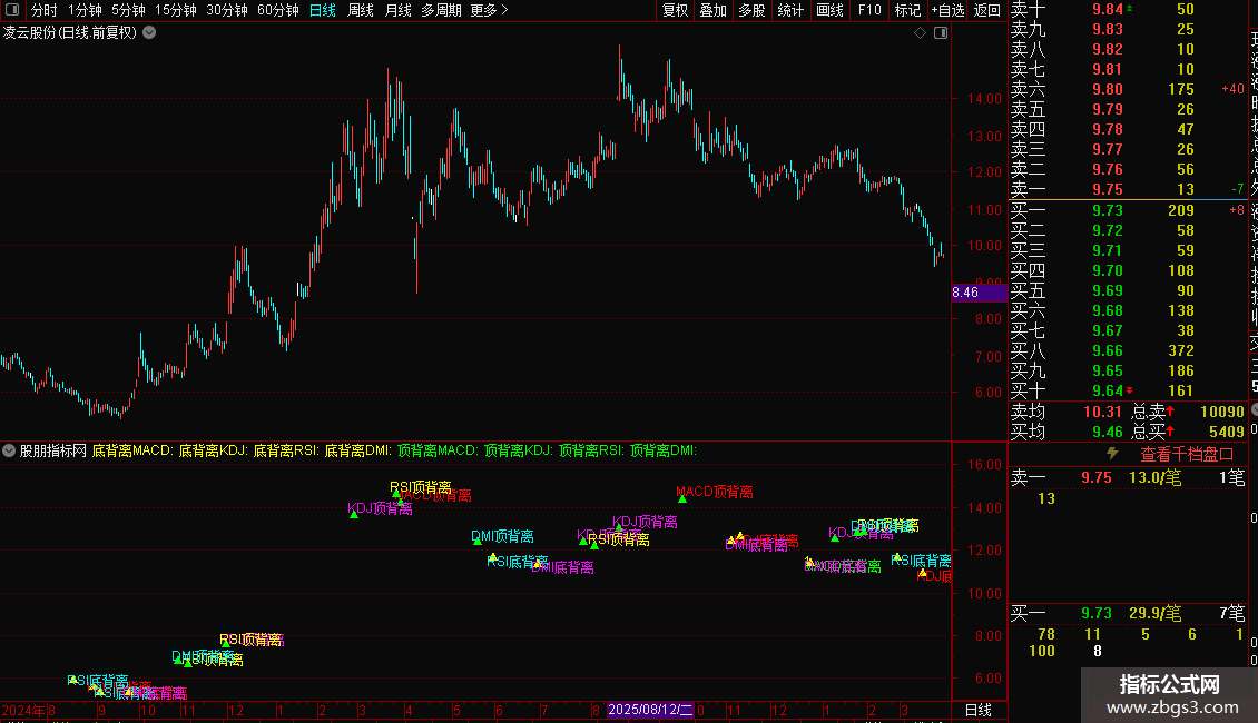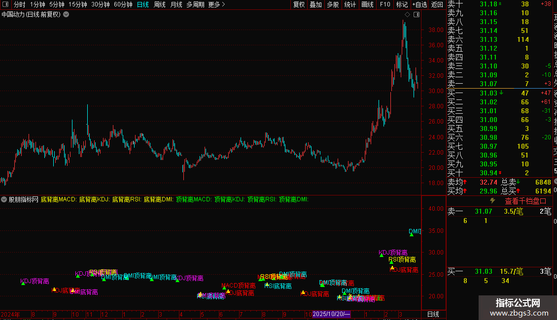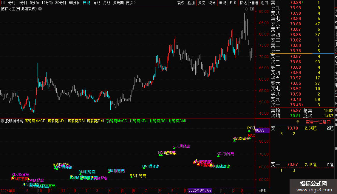 功能:在K线图上自动标注价格与指标走势发生背离的位置。当价格创新低而指标未创新低时,在相应K线低点附近标记“底背离”;当价格创新高而指标未创新高时,在相应K线高点附近标记“顶背离”。