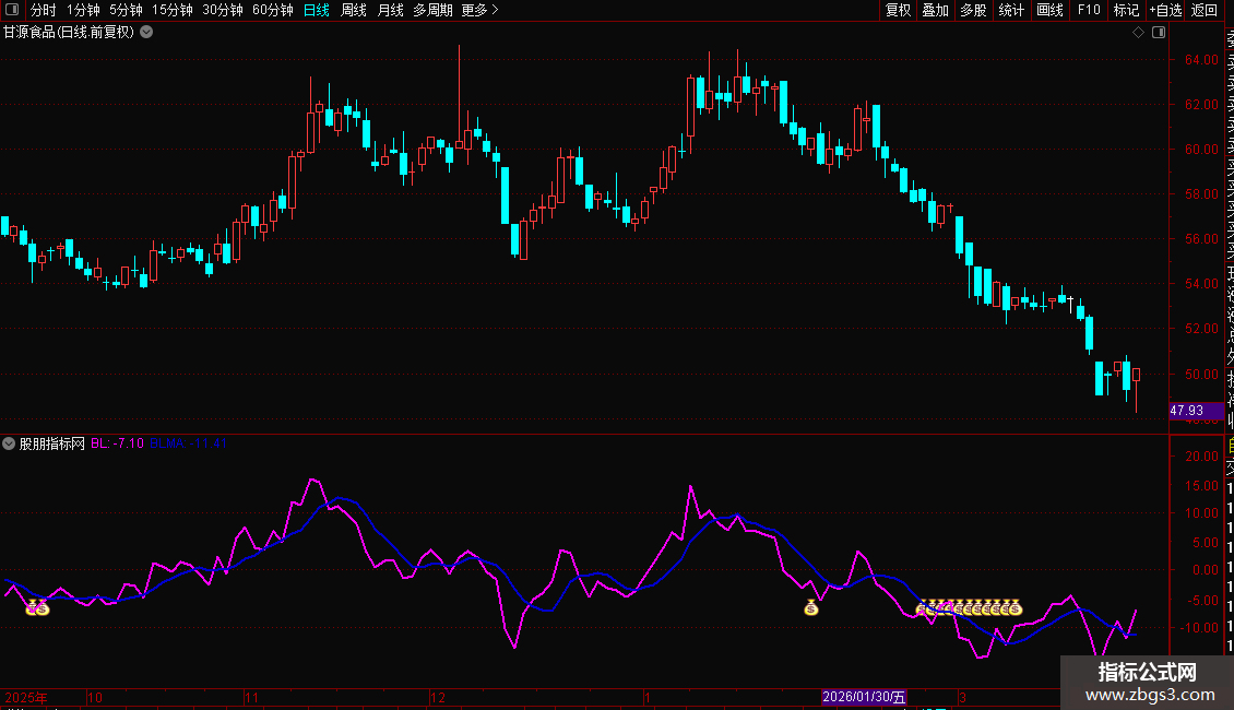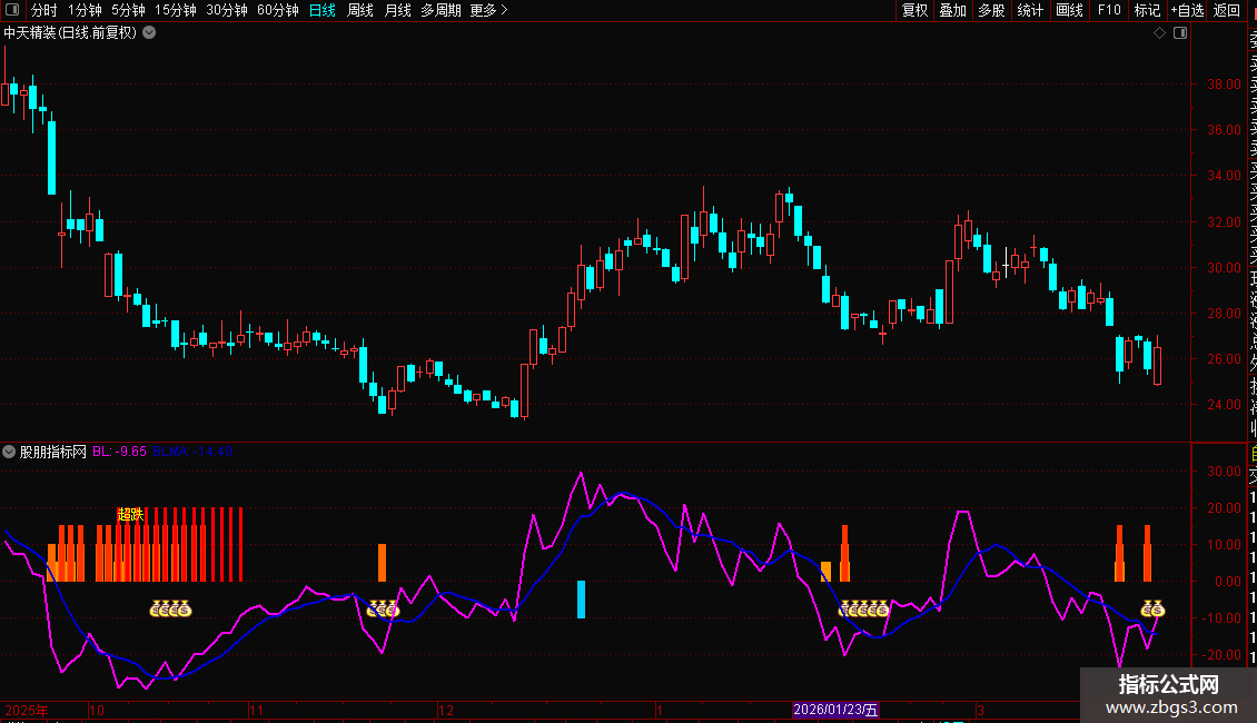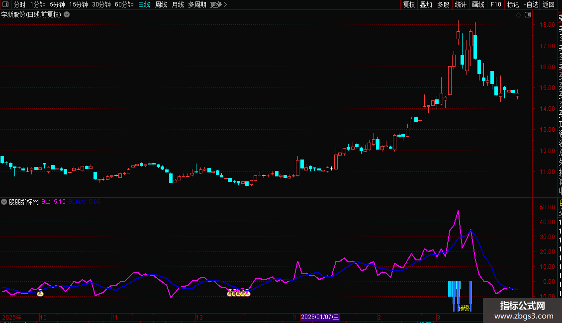 操作策略: 当出现蓝色柱子或“超跌”字样时,代表股价跌得太多,是潜在的买入关注点;当出现黄色柱子或“预警”字样时,代表股价涨得太快,需要警惕风险。如果粉线向上穿过红线,说明趋势转为看多,反之则看空。