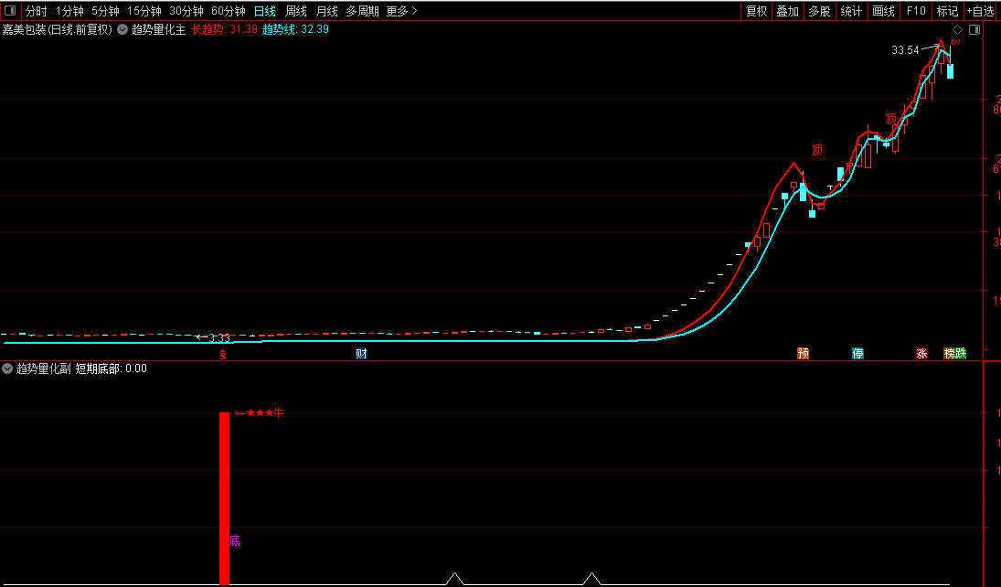 副图综合了超买超卖、筹码成本、主力资金和波动率的多因子量化指标,主要用于捕捉个股的阶段性底部、主力吸筹信号以及大级别牛市启动点实战应用技巧: