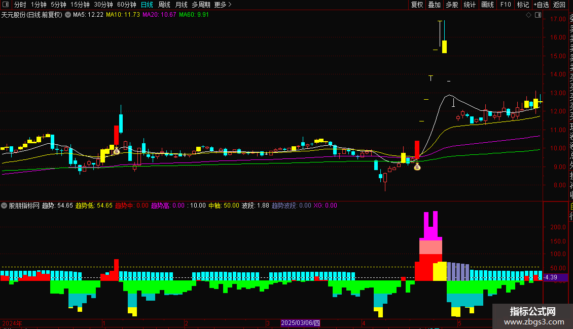 功能:指标包含两部分。上半部分通过柱状图显示趋势的强弱;下半部分则反映股价相对于市场平均成本的波动,并包含一个核心的选股信号。