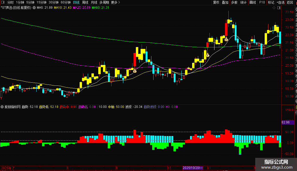 趋势高:IF(趋势>=80,趋势,0),COLORMAGENTA,NODRAW;10,COLORWHITE,DOTLINE;