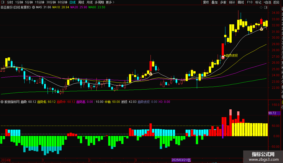 STICKLINE(波段>0 AND 趋势>=60,0,趋势,3,0),COLOR00FFFF;