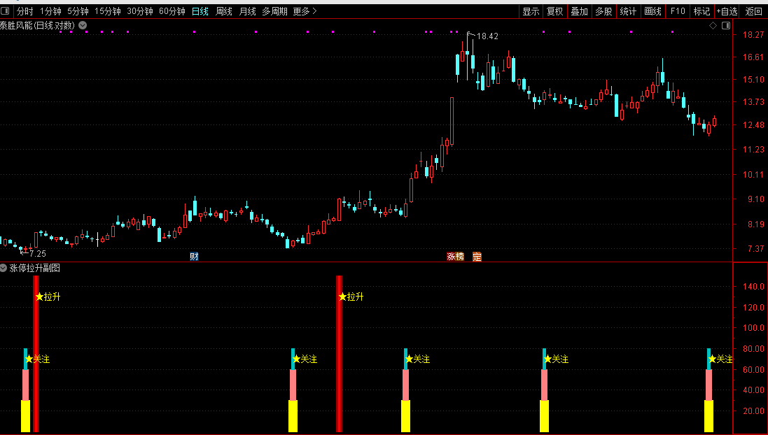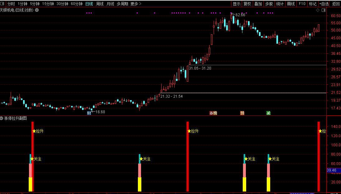 策略:当出现“关注”信号时,表示股票在上升趋势中出现了短线介入机会。当出现“拉升”信号时,表明上涨动能强劲,是持股或跟进的标志。