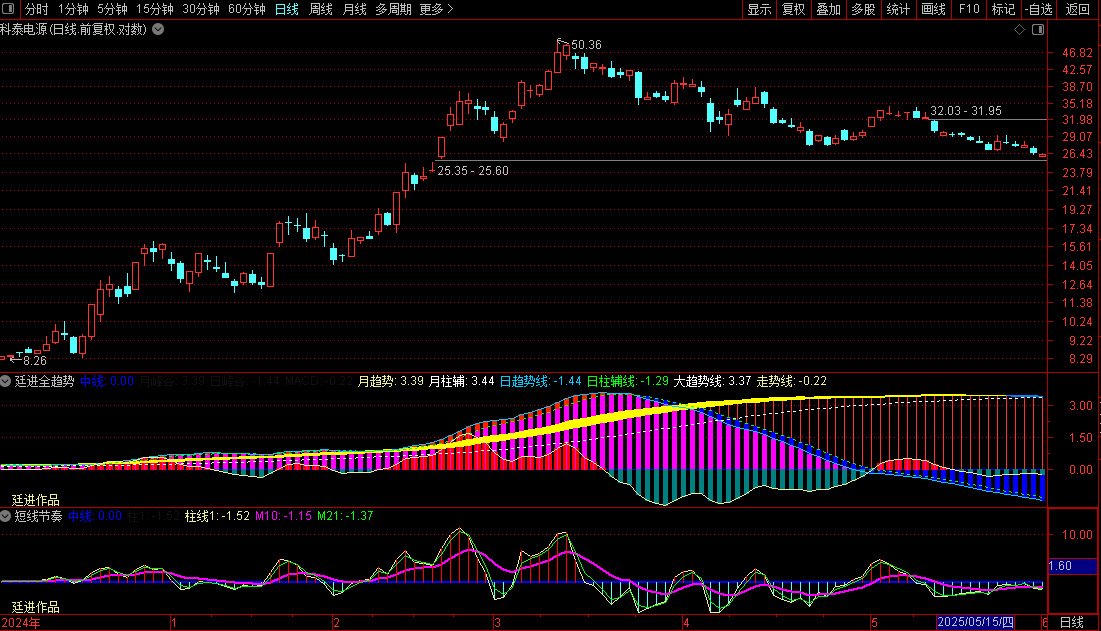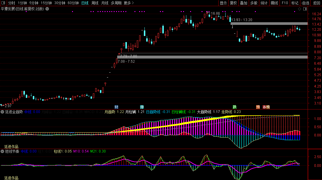 粉色柱(MACD > 0且走势柱 > 中线):短线攻击力强,持仓阶段。
