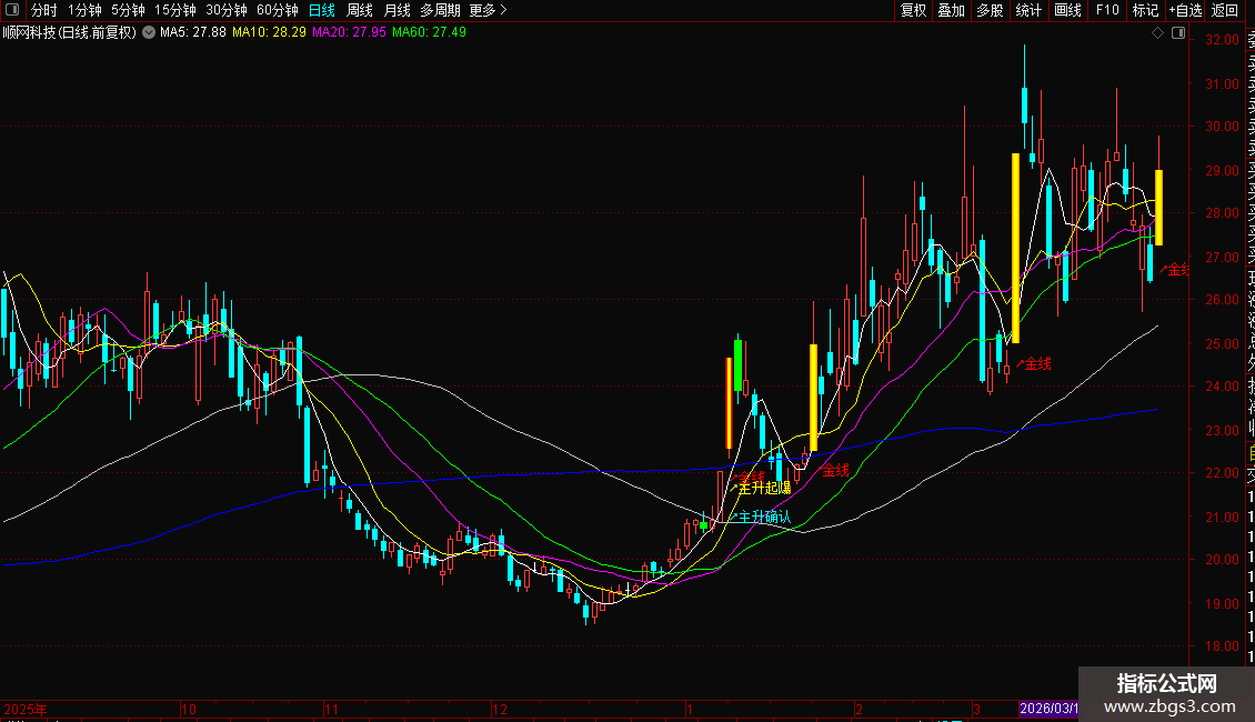 当K线图上出现“主升起爆”或“主升确认”的文字提示,并伴随特殊的彩色K线时,可视为一个强烈的买入信号。
